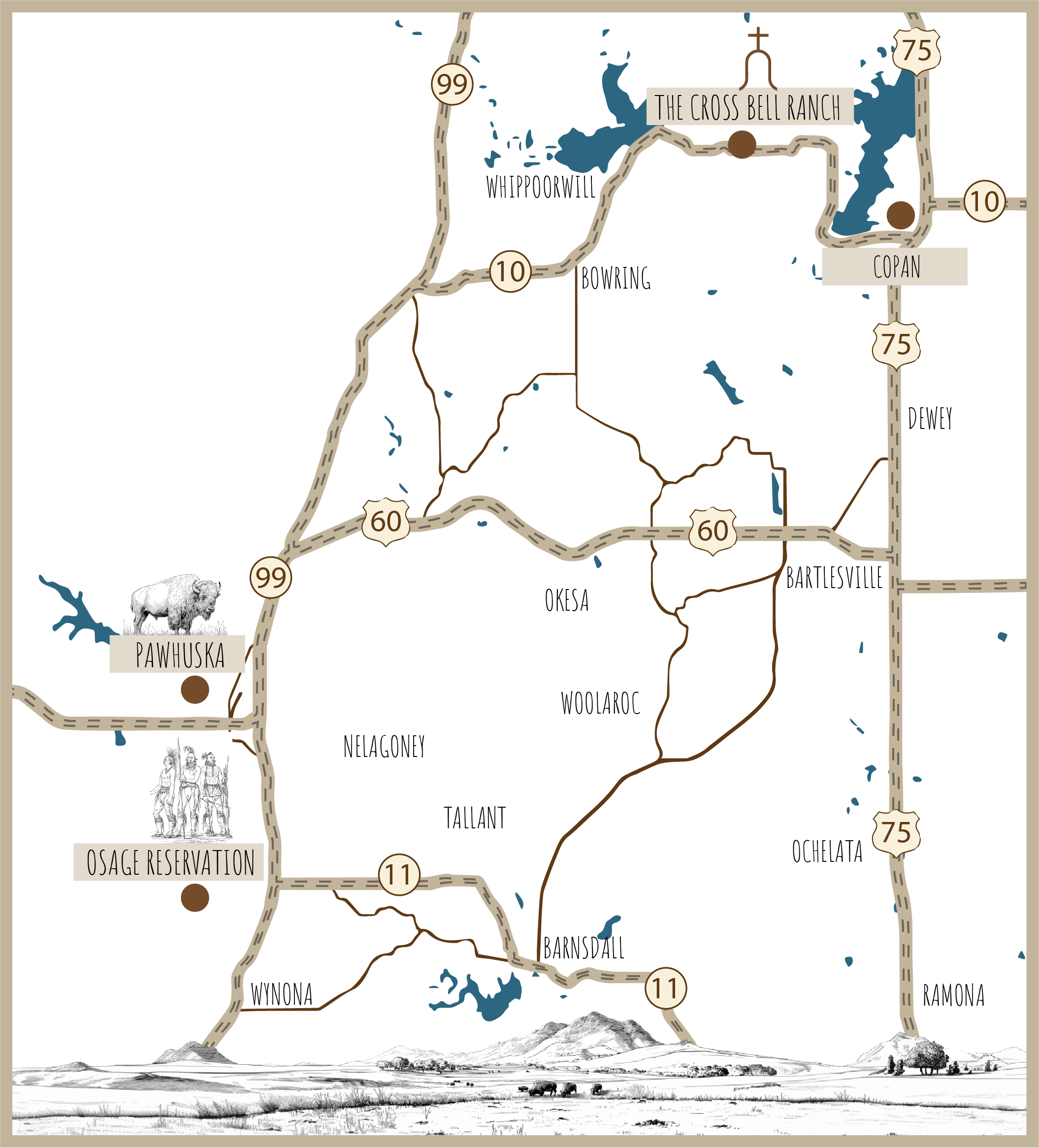 Situated in the heart of Osage County, The Cross Bell Ranch is a historic, family-owned property spanning approximately 52,000 acres. Known for its sweeping landscapes and deep ranching roots, The Ranch continues its legacy through activities like hunting, horseback riding, and hands-on ranch experiences. It also serves as a gathering place for special events, including the renowned Bluestem Special Cattle Auction.