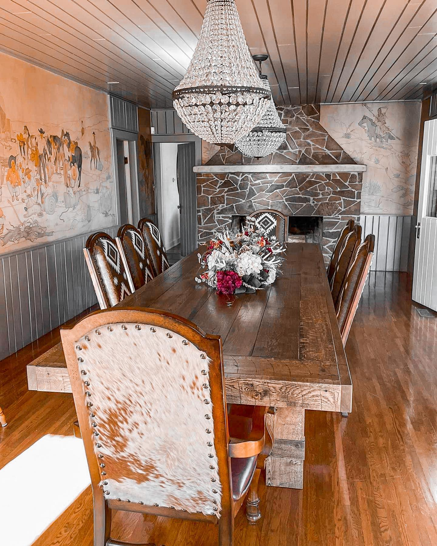 The mural is more than decoration—it’s a preserved window into the past, painted during an era when the legacy of the West still echoed in everyday life. Framed by the room’s rustic wood paneling and anchored by the sturdy stone fireplace, the artwork infuses the space with authenticity and timeless character. Guests seated at the long ranch table can take in this living piece of history, where the brush of Sheppard meets the heart of Osage ranching heritage.
