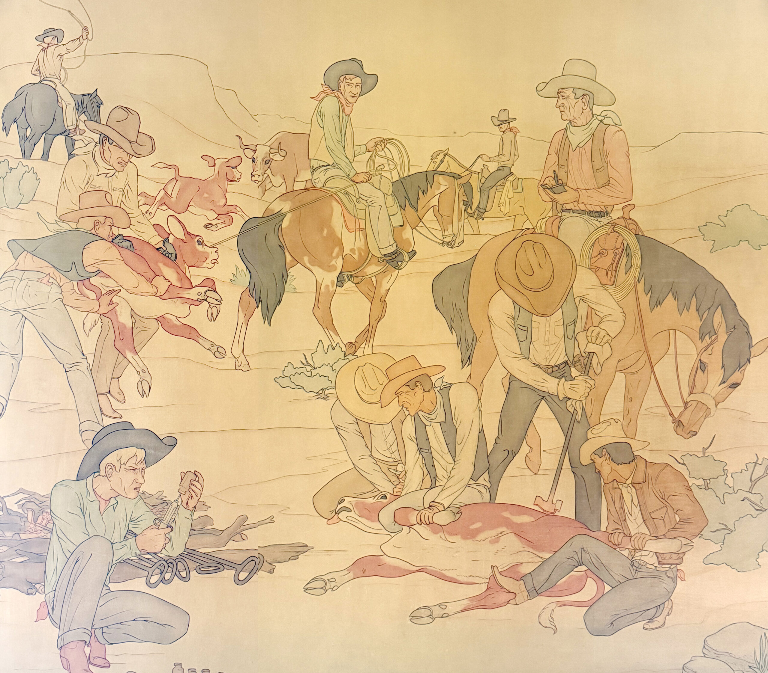 The mural spans the full length of the room’s walls, capturing a vibrant and nostalgic tableau of cowboy life on the open range.